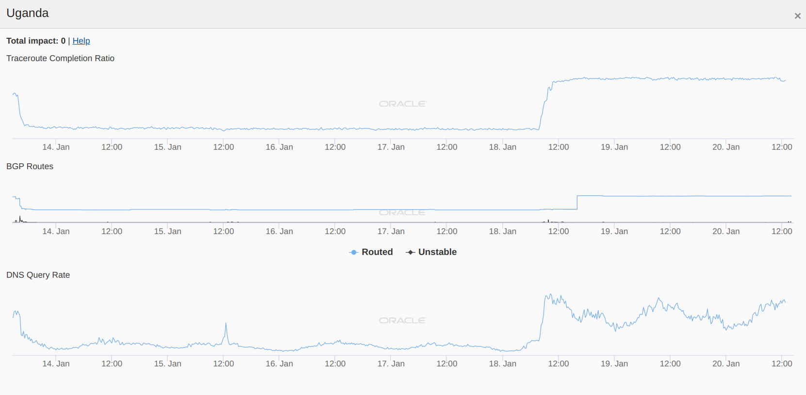 Oracle’s Internet Intelligence Map (shared above) used to track internet disruptions worldwide based on three signals: Traceroute completion ratio, BGP routes, and DNS query rate. Between 13th to 18th January 2021, Oracle’s Internet Intelligence Map (now discontinued) recorded almost identical timings in the drop of signals as IODA data.