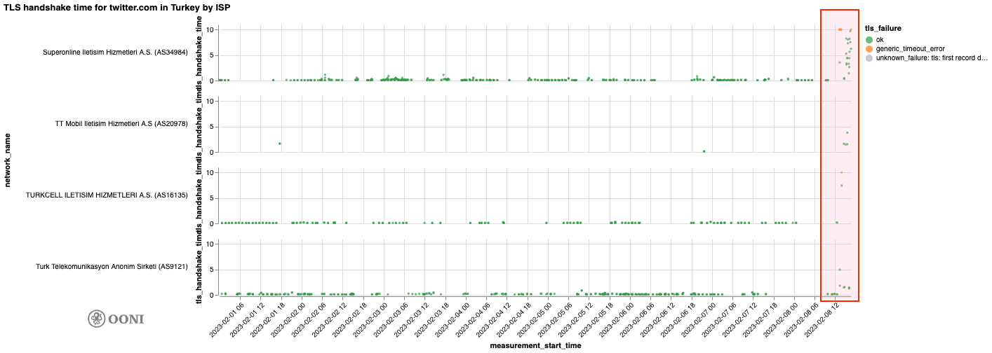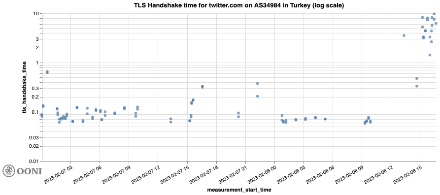 We can see that while the TLS handshake time for Twitter IPs was previously ~100ms on Turkcell Superonline (AS34984), it significantly increased to more than 3 seconds after 15:00 UTC on 8th February 2023.