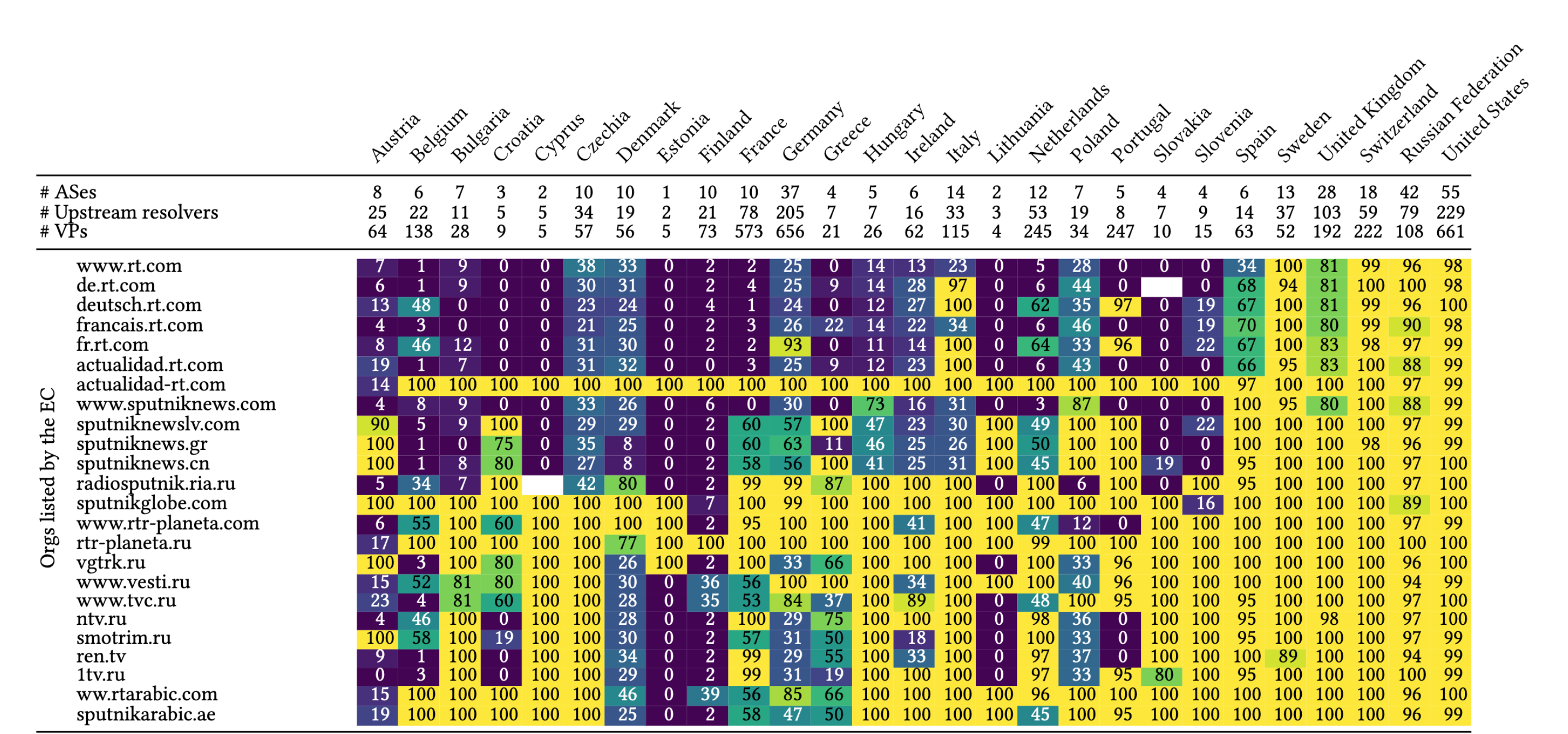 This might also be the reason why blocking in Europe does not follow a consistent pattern. Figure 2 shows blocking at ISPs. Each cell represents the percentage of unblocked responses per country and domain name received for DNS queries sent to ISP resolvers from RIPE Atlas vantage points. A bright yellow colour indicates that all or almost all queries from vantage points in a certain country towards a particular domain name were unfiltered. A dark purple colour indicates that most of our queries for sanctioned domain names were blocked.